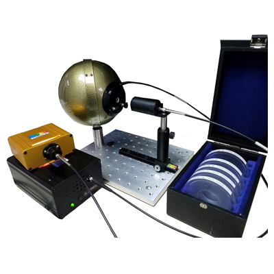 The StellarHaze System is preconfigured for total transmission and haze measurements and includes a compact fiber optic spectrometer, light source with integrated optical amplification and collimation lens, custom haze measurement sphere with diffuse transmission port and sample attachment clips. The sphere is mounted on a breadboard with alignment track for easy positioning.